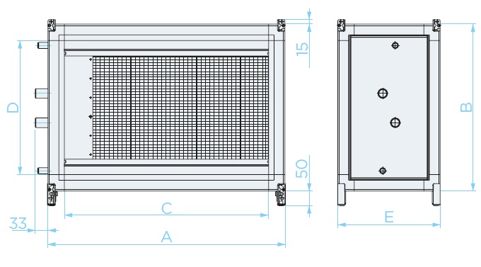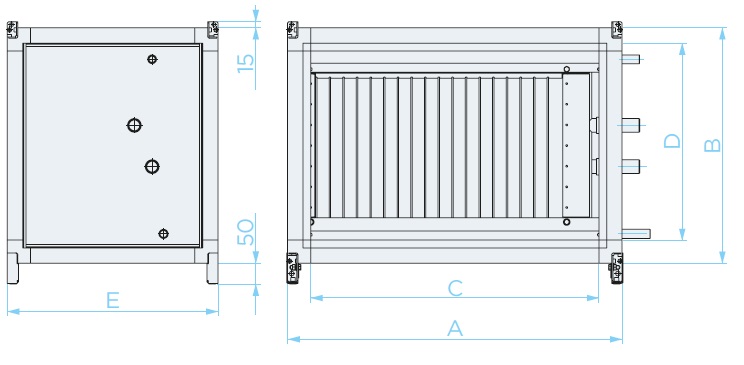 | Типоразмер | Расход воздуха, м³/час | Расход теплоносителя, л/с | Гидравлическое сопротивление, кПа | D, Темп. Приточного воздуха на выходе, °Cмм | КПД рекуператора, % | Мощность нагрева, кВт |