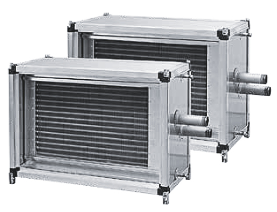 Рекуператор с промежуточным теплоносителем представлен восемью типоразмерами. Система рекуперации представляет собой схему передачи теплоты вытяжного воздуха приточному с помощью двух жидкостных теплообменников, находящихся в вытяжной и приточной камерах. Предназначен для эксплуатации при максимальном рабочем давлении водногликолевой смеси 1,5 МПа. В качестве промежуточного теплоносителя рекомендуется применять растворы этиленгликоля и пропиленгликоля с концентрацией до 50%. Поверхность теплообменника изготовлена из алюминиевых пластин и проходящих через них в шахматном порядке медных трубок. Трубные коллекторы из стали имеют резьбовые патрубки, выведенные за боковую панель, а также специальные отверстия для обезвоздушивания теплообменника и слива воды. Исполнение теплообменников восьмирядное. Вытяжная часть дополнительно оснащена профильным пластиковым каплеуловителем с поддоном и патрубком для сбора и слива конденсата. Правое или левое исполнение по стороне подвода водногликолевой смеси. При монтаже изменение стороны обслуживания вытяжной части невозможно. Все теплообменники испытываются на герметичность водой под давлением 16 бар в течение 3 минут.