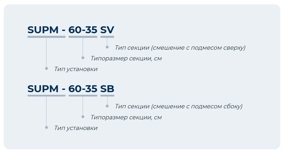 Секция смешения с подмесом сверху SUPM SV и подмесом сбоку SUPM SB предназначена для установок с рециркуляцией, с резервным вентилятором или для организации забора или выхлопа воздуха в нужном направлении.
