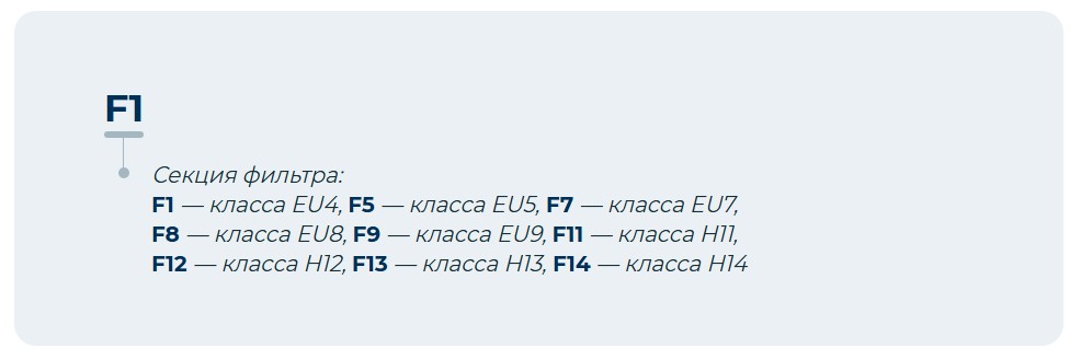Секция фильтрования представлена восемью типоразмерами и предназначена для очистки воздуха и защиты элементов центрального кондиционера от пыли. Присутствие в воздухе пыли снижает теплотехнические показатели установки и приводит к увеличению ее аэродинамического сопротивления. Секция фильтров в центральных кондиционерах представлена девятью ступенями очистки с фильтрующими вставками EU4, EU5, EU7, EU8, EU9, H11, H12, H13, H14. Вставки EU4 и EU5 применяются в качестве фильтра первой ступени очистки перед фильтром более высокого класса очистки. Вставка EU5 может использоваться и как вторая ступень очистки. Вставки EU7, EU8, EU9 применяются, как правило, в качестве второй ступени очистки для помещений с высокими требованиями по чистоте воздуха. Панель фильтров устанавливается на салазках, что позволяет выдвигать ее при замене фильтрующих вставок. Допускаемое падение давления на фильтре при его загрязнении может контролироваться дифференциальным датчиком давления. Высокоэффективные фильтры H11-H14 применяются в качестве фильтра последней ступени очистки в многоступенчатых системах очистки приточной вентиляции, а также для конечной очистки воздуха в системах приточной вентиляции до уровня «стерильности» в чистых зонах микроэлектронной, микробиологической, пищевой, фармацевтической промышленности, на атомных производствах.