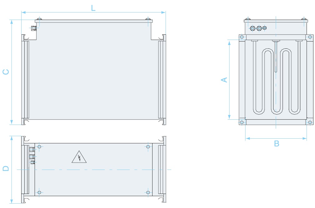 Электрический воздухонагреватель типа SPH-E предназначен для нагрева воздуха. Он применяется в канальных системах вентиляции и кондиционирования воздуха промышленных и общественных зданий. Воздухонагреватель изготавливается в девяти типоразмерах в зависимости от соединительного фланца воздуховода. В качестве нагревающих элементов в воздухонагревателе типа SPH-E используются трубчатые электрические элементы (ТЭНы). Широкий диапазон электронагревателей (от 3 до 60 кВт). Корпус воздухонагревателя выполнен из оцинкованного стального листа. Точное поддержание температуры приточного воздуха, сниженная нагрузка на электрическую сеть за счет применения равных ступеней мощности. Защита от перегрева осуществляется двумя встроенными термостатами, гарантирующими безопасную и надежную работу. Рабочая температура электрического воздухонагревателя типа SPH-E от –40 до +40°С. Электроизоляция IP 40. Питающее напряжение 220 В и 380 В (в зависимости от модели). Рекомендуется использовать фильтры SFP или SFPK, которые полностью обеспечивают защиту от загрязнения электрических воздухонагревателей. Мощность электрического воздухонагревателя регулируется автоматически блоками управления SBUP или SBUT, температура на выходе за обогревателем должна быть ограничена 40°С. Установка фильтра непосредственно перед воздухонагревателем недопустима. В случае, когда вентиляционная система отключается вручную (при отсутствии автоматического обдува ТЭНов), необходимо в первую очередь выключить воздухонагреватель, а затем после остывания воздухонагревателя (1-3 мин.) отключить вентилятор и закрыть вентиляционные заслонки.