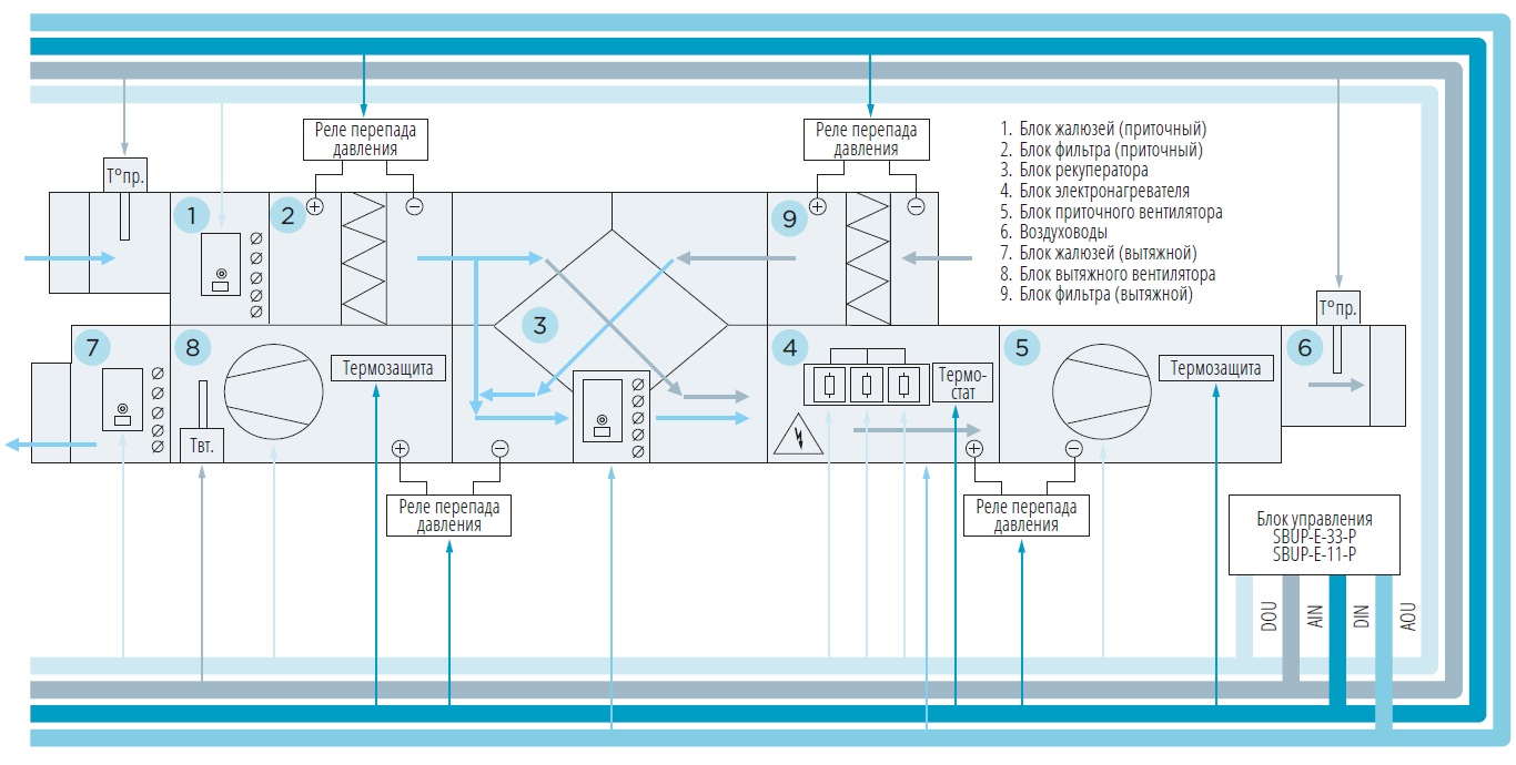 Пластинчатый рекуператор предназначен для утилизации тепла (холода). Вытяжной, удаляемый из помещения, воздух протекает в каналемежду пластинами теплообменника, нагревая их. Приточный воздух, протекая через остальные каналы теплообменника, нагревается. Теплообменник изготовлен из алюминиевых пластин, создающих систему каналов для протекания двух потоков воздуха. В теплообменнике происходит теплопередача между этими тщательно разделенными потоками с различной температурой. При данном типе рекуперации происходит полное разделение воздушных потоков, что позволяет использовать пластинчатые рекуператоры в системах с высокими требованиями к чистоте воздуха. КПД пластинчатых рекуператоров составляет около 70%, при этом перепад давления на данном элементе, как правило, не превышает 200250 Па. Рекуператоры практически не требуют энергозатрат при эксплуатации и обладают высокой надежностью благодаря отсутствию движущихся частей. Конструкция позволяет использовать их в приточно-вытяжных установках как ярусного, так и смежного исполнения. На пластинах может образовываться конденсат, для слива конденсата они оборудованы отводами. В комплект входит штуцер, который устанавливается на съемную панель. Конструкция съемной панели представляет собой своеобразный поддон, в котором скапливается конденсат. Для исключения обледенения в ХПГ на теплообменнике устанавливается датчик температуры или давления, управляющий положением клапана обводного канала. Открывается обводной воздушный канал и закрывается воздушный клапан, установленный на стороне приточного воздуха. Приточный воздух проходит через обводной канал теплообменника, а вытяжной через рекуператор, нагревая при этом замерзшую поверхность теплообменника. После оттаивания и снижения перепада давления закрывается обводной канал и открывается теплообменник для прохода приточного воздуха.