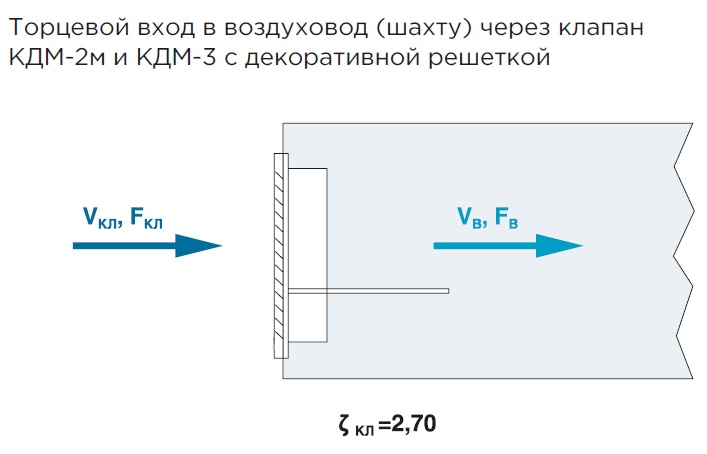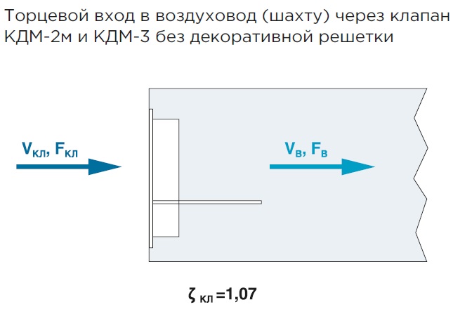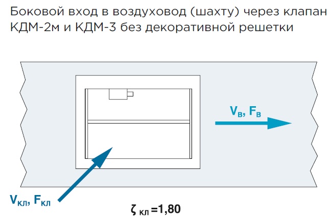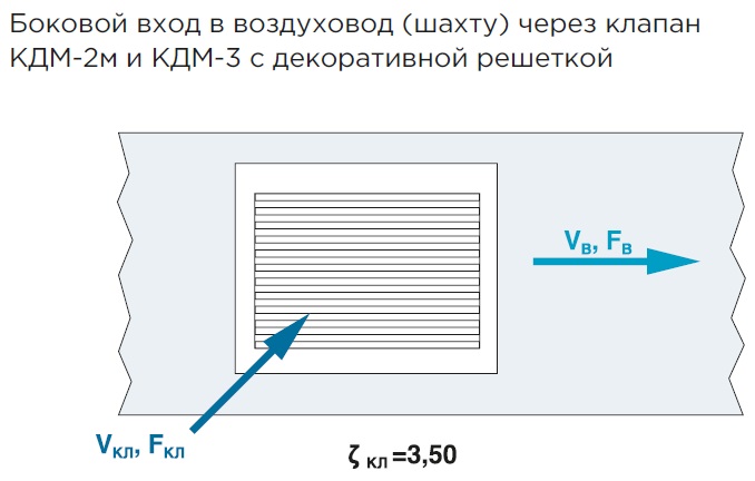 ζв — коэффициент местного сопротивления, относящийся к скорости в воздуховоде (шахте) VВ, ζкл — коэффициент местного сопротивления, относящийся к скорости в проходном сечении клапана VКЛ, FВ — площадь внутреннего сечения воздуховода (шахты), м2, FКЛ— площадь проходного сечения клапана FКЛ = ((А-30)х(В-50))/102, м2, А и В —установочные размеры клапана, мм (А>В), ζв = ζкл (FВ / FКЛ).