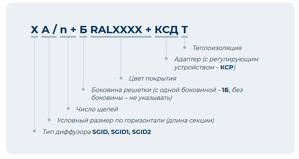 Пример обозначения при заказе 2-х щелевой решётки SGID длиной 9 м с двумя боковинами, белого цвета RAL9016 с камерой статического давления без регулирующего устройства, без теплозвукоизоляции: SGID 9000/2 + Б + 2КСД М Решетки с камерами 2КСД М длиной более 2 м изготавливаются из набора решеток с камерами 2КСД М от 0,5 до 1 м с шагом 50 мм. Подбор камер осуществляется следующим образом: