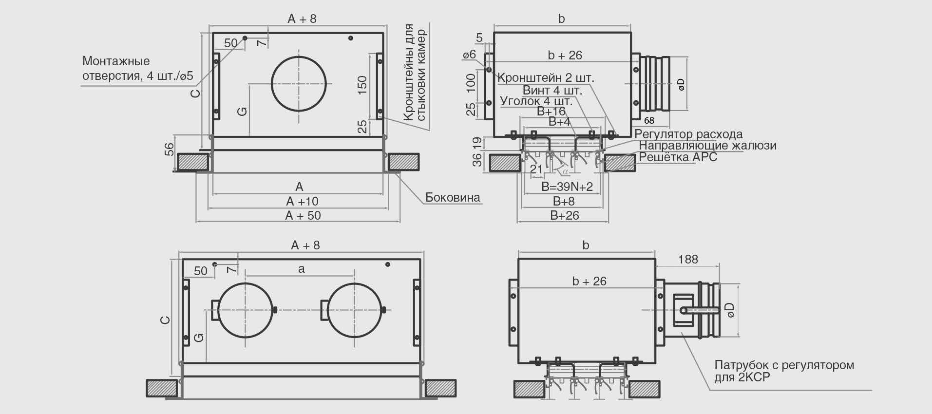 Для регулирования расхода воздуха камеры статического давления 2КСР М оснащены регулирующим устройством, которое устанавливается во входном патрубке. Для решёток АРС, АЛС применение 2КСР М нецелесообразно, так как изменение расхода осуществляется непосредственно в распределителе. Камера статического давления действует как простейший камерный глушитель, снижая шум, распространяющийся по вентиляционной сети на 4-6 дБ.Камеры статического давления могут изнутри покрываться слоем теплоизоляционного и звукопоглощающего материала. При этом габаритные размеры камеры статического давления не изменяются. Такая облицовка усиливает эффект снижения камерой шума, приходящего по сети к воздухораспределителю, дополнительно на 6-8 дБ (преимущественно на высоких частотах), а также сокращает потери холода (тепла) приточного воздуха и предотвращает образование конденсата на поверхности КСД при температуре воздуха ниже точки росы. КСД изготавливаются из оцинкованной стали, с боковым подводом воздуха по стороне А решётки. В зависимости от длины воздухораспрделителя в камеру устанавливается один или два входных патрубка. Монтаж КСД к строительным конструкциям производится с помощью металлических тросов или с помощью резьбовых шпилек через монтажные отверстия в камере. Крепёжные элементы в комплект поставки не входят. Подшивной потолок устанавливается после монтажа камер. Щелевые решетки с камерами статического давления представляют собой разборную конструкцию, в которой решетки крепятся на камеры с помощью винтов через металлические уголки, установленные в решетках, винты вкручены в резьбовые втулки, установленные на кронштейне камеры. Щелевые решетки с камерами статического давления изготавливаются от размера 500 мм до 2000 мм с шагом 50 мм. Так же все щелевые решетки с камерами статического давления имеют возможность для монтажа в одну линию, стыковка осуществляется через отверстия в кронштейнах для стыковки на камерах болтовым соединением (крепеж в комплект поставки не входит). В случае, если имеются особые требования к подбору решеток с камерами для монтажа в одну линию, необходимо согласование эскиза. При заказе щелевых решеток с камерами статического давления с нестандартной высотой «С» и (или) нестандартным диаметром «D» присоединительного патрубка, также требуется согласование эскиза.