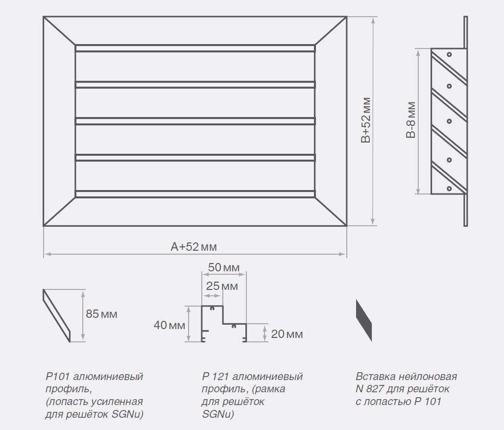 Решетка SGNu используется в системе вентиляции и кондиционирования воздуха. Предназначены для монтажа строительные проёмы в помещениях, а также систему вентфасадов. Решётки изготовлены из алюминиевого профиля в виде рамки и жёстко закреплённых лопастей под углом 65 град. Рамка решётки выполнена из усиленного профиля. Лопасть Р 101 набираются на рамку из профиля Р121 с помощью разделителя N 827. Решётки окрашены в белый цвет. Возможна окраска в любые цвета каталога RAL. Также возможно изготовления решёток нестандартного размера.