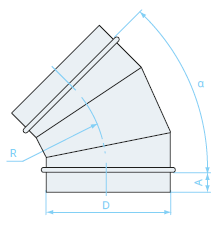 Отвод предназначен для изменения направления воздушного потока в системах вентиляции. Стандартные круглые отводы изготавливаются с углами поворота 90, 60, 45, 30 и 15°. Радиус поворота R в стандартном отводе равен его диаметру D.
